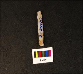 | Description / विवरण | Paralled sided microlithic blade with two ridges on dorsal trapezoidal in section, diffused bulb on ventral broken at distal end and use wear marks on cutting edges. |
