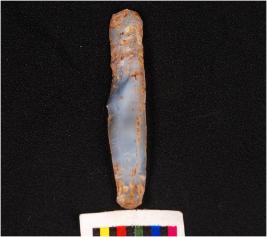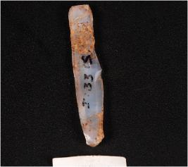 | Description / विवरण | Parallel sided blade made on chalcedony two ridge on dorsal ventral surface rough with diffuse bulb use wear marks on edge. |