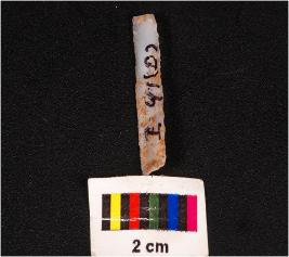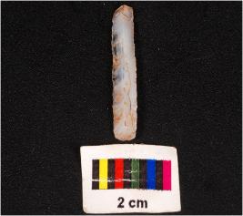 | Description / विवरण | Parallel sided blade, made on chalcedony mid ridge on dorsal ventral surface is rough and prominent bulb on ventral and use wear marks on edge. |