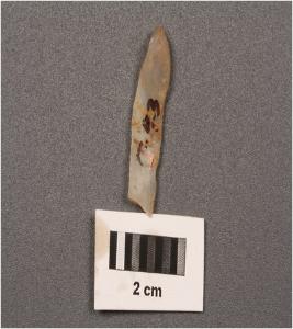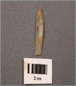 | Description / विवरण | Pen knife blade made on chalcedony with double ridge on dorsal side and diffused bulb on ventral distal end is sharp and use wear marks on both edges |