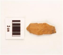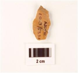 | Description / विवरण | A stone scrapper made on chert, yellow in colour, side scrapper use wear marks on both edges. |