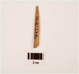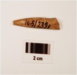| Description / विवरण | Fragment of bone point with irregular circular-cross section, broken at one end another end slightly broken at point and smooth surface. |