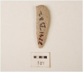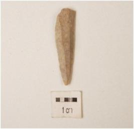 | Description / विवरण | Blade with use wear marks on working edges, proximal end has striking platform with diffused bulb on ventral side, ridge on surface and triangular cross section. |