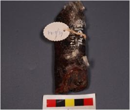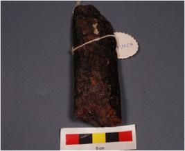 | Description / विवरण | Fragment of blade of a dagger with chemical treatment on the surface, flattened end. |