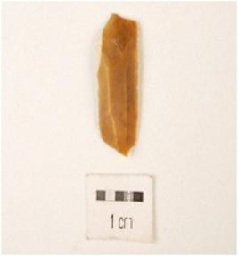 | Description / विवरण | Broken blade, broken at both ends, ridge on surface, use wear marks on working edges and triangular cross section. |