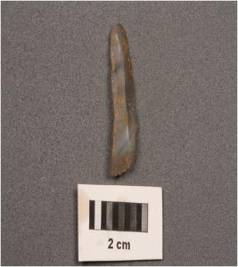 | Description / विवरण | Parallel sided blade with use-wear marks on cutting edges prominent mid-ridge on dorsal diffused bulb on ventral and triangular in section. |