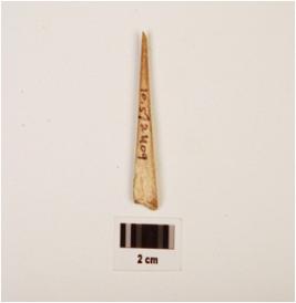 | Description / विवरण | Fragment of bone point with plano convex-cross section, one end broken another end pointed and smooth surface. |
