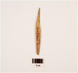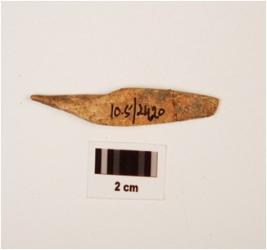 | Description / विवरण | Fragment of bone point with plano convex-cross section, one end pointed and another end broken manded, rough surface with polish. |
