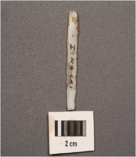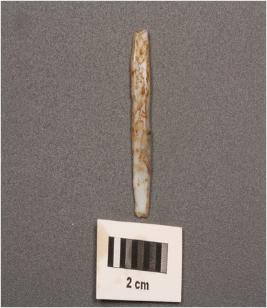 | Description / विवरण | Parallel sided microlithic blade with double ridges on dorsal diffused bulb on ventral, trapezoidal section and use wear marks on cutting edges. |
