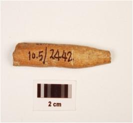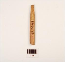 | Description / विवरण | Fragment of bone point, plano convex-cross section, both ends are broken and surface is smooth. |