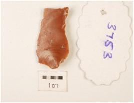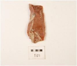 | Description / विवरण | A scraper made by chert, flake scars on the surface prominent bulb on the ventral side, prepared platform on the proximal end, distal end intact and partly retouching on the cutting edges. |