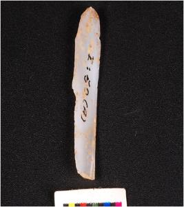 | Description / विवरण | Parallel sided blade with double ridge on dorsal intact proximal end diffused bulb on ventral broken along distal end and use-wear marks along cutting edge. |