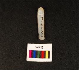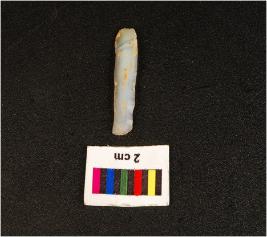 | Description / विवरण | Parallel sided microlithic blade with double ridge on dorsal trapezoidal in section, broken distal end, bulb on ventral and use wear mark along the cutting edges. |