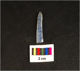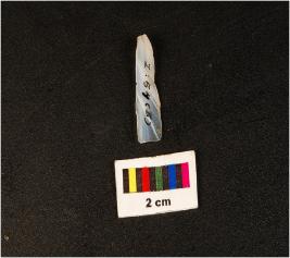 | Description / विवरण | Parallel sided chalcedony blade, prominent mid ridge on dorsal side, triangular in section, broken at distal end, diffused bulb on ventral and use wear along the cutting edges. |