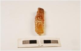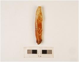 | Description / विवरण | Flake of carnelian stone with unpolished surface chipped off sides, rectangular in shape and square in section and cortex visible at one end. |