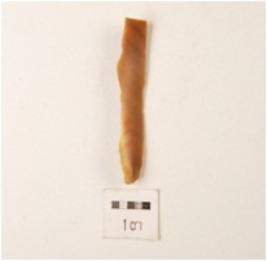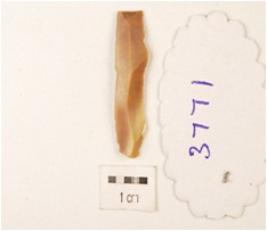 | Description / विवरण | A chert blade with mid ridge on dorsal prominent bulb on the ventral prepared platform on the proximal end and use wear on the cutting edges. |