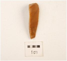 | Description / विवरण | A chert blade made by chert, flake scars on the surface, prepared platform on the proximal end distal end intact, middle ridge on dorsal and use wear on the cutting edges. |