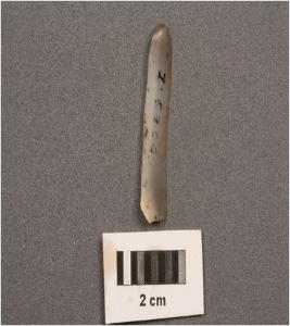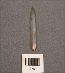 | Description / विवरण | Parallel sided chalcedony blade, mid ridge on dorsal side, cortex on distal end and use wear on edges. |