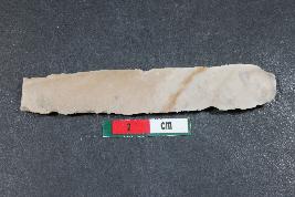 | Description / विवरण | Fragment of a Blade with two dorsal ridges having smooth surface. It also has bulb of percussion on the ventral side. |