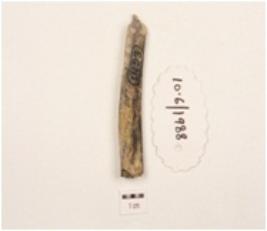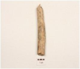| Description / विवरण | A charred bone point, broken from both ends, polished, one side has rough surface, uneven shape. |