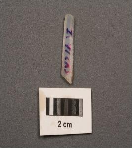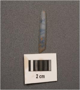 | Description / विवरण | Parallel sided microlithic chalcedony blade with two ridges on dorsal trapezoidal in section, use wear marks on cutting edges and broken from both ends. |