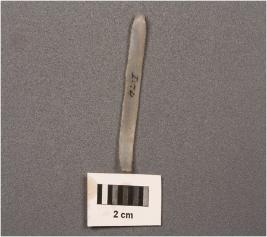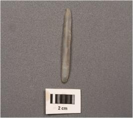 | Description / विवरण | Chalcedony parallel sided blade with a double ridge on dorsal and broken distal end. |