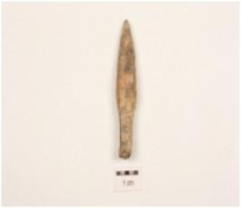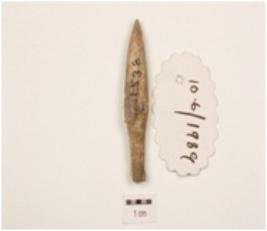| Description / विवरण | A bone arrow head, intact sharpened end, polished, intact tang, uneven and rough surface. |