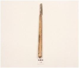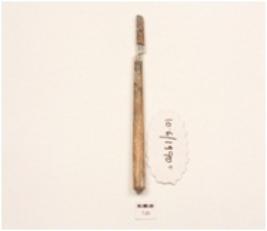| Description / विवरण | Fragment of a bone point, charred at the tip, polished broken in two pieces, circular section, smooth surface, |