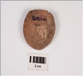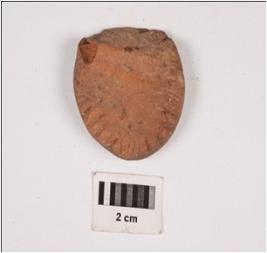 | Description / विवरण | A handmade terracotta disc with incised designs along the edges on both sides, made with fine clay and well baked, surface treated in dull red wash. Partly broken. |