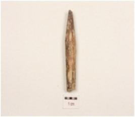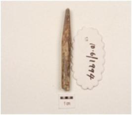 | Description / विवरण | A charred bone point, polished, circular section, chipped off tip, broken other end, uneven surface. |