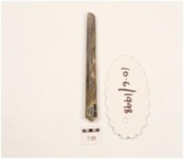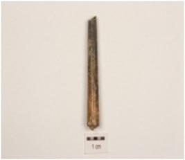 | Description / विवरण | Fragment of charred bone point, two pieces, polished, cracks on surface, partly weathered surface, broken ends. |
