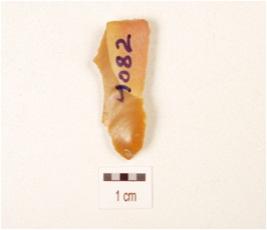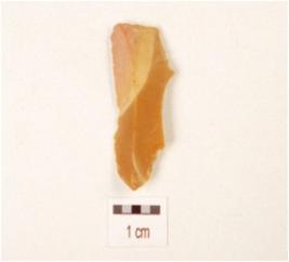 | Description / विवरण | A blade, made on chert with prominent mid-ridge on dorsal side, prepared platform, bulb on ventral, use wear marks on cutting edge and triangular in section. |