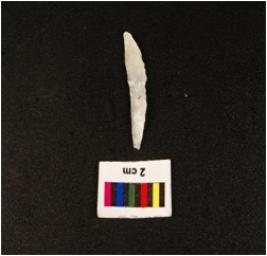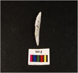 | Description / विवरण | Parallel sided blade with prominent mid ridge on dorsal triangular in section distal end and proximal ends are broken, use wear mark along the cutting edges. |
