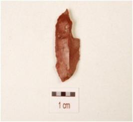 | Description / विवरण | A blade, made on chert with prominent mid-ridge on dorsal side, use-wear marks on cutting edge and triangular in section. |