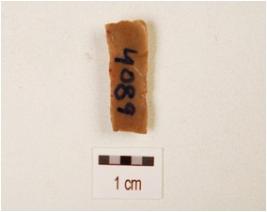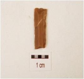 | Description / विवरण | Fragment of chert blade with double ridge on dorsal side, use-wear marks on cutting edge and trapezoidal in section. |