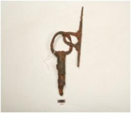 | Description / विवरण | An iron door ring, eroded chemically treated and rusted, flat and broad portion used for fixing in the wooden door with supporting iron handle two decorative ring with criss cross design on the handle and lower portion is partly broken. |