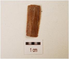 | Description / विवरण | Fragment of blade, made on chert with double ridge on dorsal side, trapezoidal in section and use wear marks on cutting edge, both ends broken. |