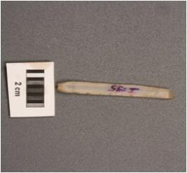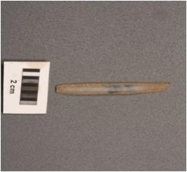 | Description / विवरण | Parallel sided microlithic blade with two ridges on dorsal diffused bulb on ventral partly broken along distal end, trapezoidal in section and use wear marks on cutting edges. |