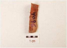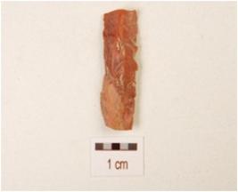 | Description / विवरण | A blade, made on chert with prominent mid-ridge on dorsal side, use wear marks on cutting edge triangular in section, prepared platform and diffused bulb on ventral. |