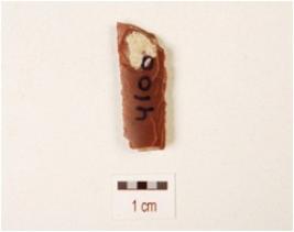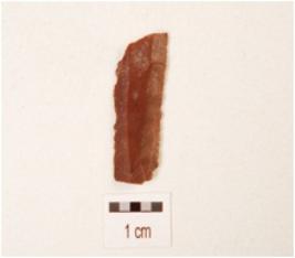 | Description / विवरण | Fragment of blade, made on chert with double ridge on dorsal side, use wear marks on cutting edge and trapezoidal in section. |