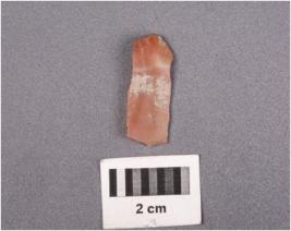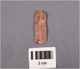 | Description / विवरण | Parallel sided blade of chert with a mid-ridge on dorsal side, prepared platform, prominent bulb on ventral side, triangular in section and use-wear marks along the cutting edges. |