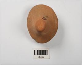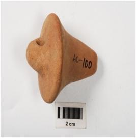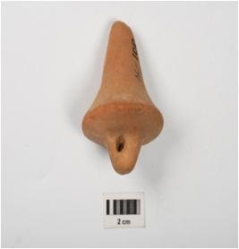 | Description / विवरण | Handmade terracotta plumb bop, perforation on one side, mica visible on surface, chipped off, wash treatment given in red colour. |