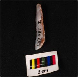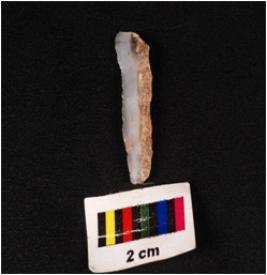 | Description / विवरण | A blunted blade with two ridge on dorsal naturally blunted left edge with cortex on surface, use-wear marks along the right cutting edge, diffused bulb on ventral and raw material was given heat treatment. |