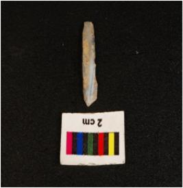 | Description / विवरण | A Parallel sided chalcedony blade with prominent mid ridge on dorsal, diffused bulb on ventral broken at distal end, use wear marks along the cutting edges and triangular in section. |