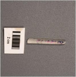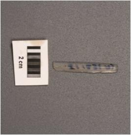 | Description / विवरण | Parallel sided blade, diffused bulb on ventral striking platform, distal end broken, use wear marks on one working edge and ridge on dorsal. |