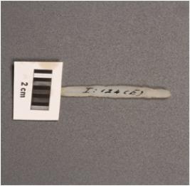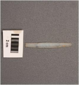 | Description / विवरण | Parallel sided chalcedony blade, with double ridge on dorsal and diffused bulb on ventral and use wear marks on edge. |