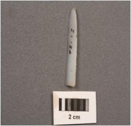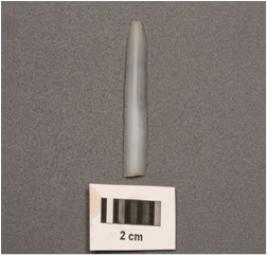 | Description / विवरण | Parallel sided chalcedony blade, two ridges on dorsal side, use wear cutting mark on edges, diffused bulb ventral and slightly broken along distal end. |