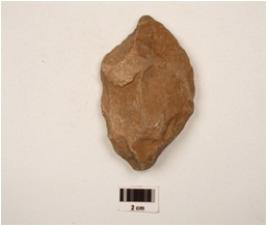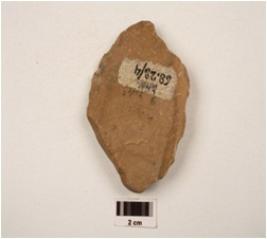 | Description / विवरण | Scraper made on end struck quartzite flake with prepared platform, flake scars on dorsal side and prominent bulb on ventral side, retouched marks along cutting edges. |