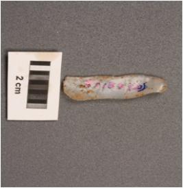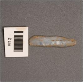 | Description / विवरण | Microlith blade on chalcedony with double ridge on dorsal, trapezoial in section with bulb on ventral and use-wear marks on cutting edges. |