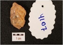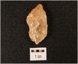 | Description / विवरण | A utilized flake, made on quartz with flake scars on dorsal, prepared platform and use wear marks on edge. |